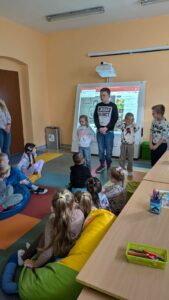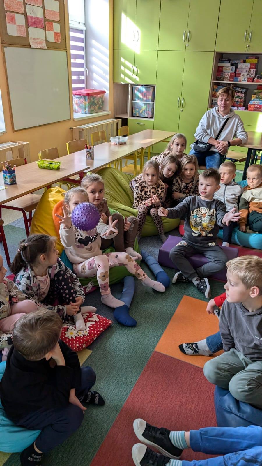 Dzisiaj przedszkolaki z grupy Jagódki spotkały się z uczniami klas 1-3, by wspólnie świętować ulubione bajkowe historie. Były bajki na dużym ekranie, opowieści o ukochanych bohaterach i zagadki, które rozwiązywaliśmy z uśmiechem. Magiczny dzień pełen wspólnej zabawy i wyobraźni.