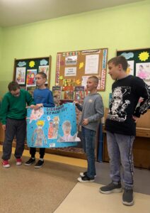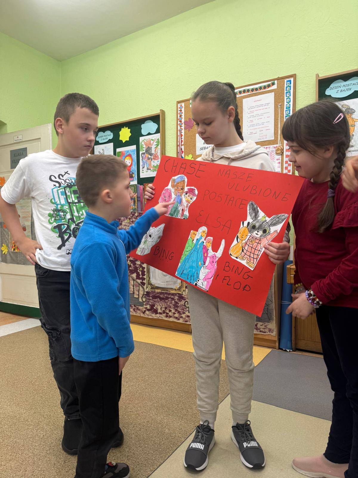 W dniu 17.11.2025r. w naszej szkole odbyła się impreza „DZIEŃ POSTACI Z BAJEK”. Na początku spotkania pani Dorota przedstawiła teatrzyk kamishibai „Noc w bibliotece”. Uczniowie oglądali przedstawienie z dużym zainteresowaniem i ciekawością. Następnie w wymieniali występujące w bajce postaci. Po czym wszystkie klasy przedstawiły swoje plakaty z ulubionymi bohaterami. Prace były bardzo twórcze, pomysłowe i niezwykle kreatywne. Uczniowie otrzymali dyplomy za udział w imprezie, a na koniec pozowali do zdjęcia w FOTO BUDCE. Dziękujemy za przybycie i do zobaczenia wkrótce.