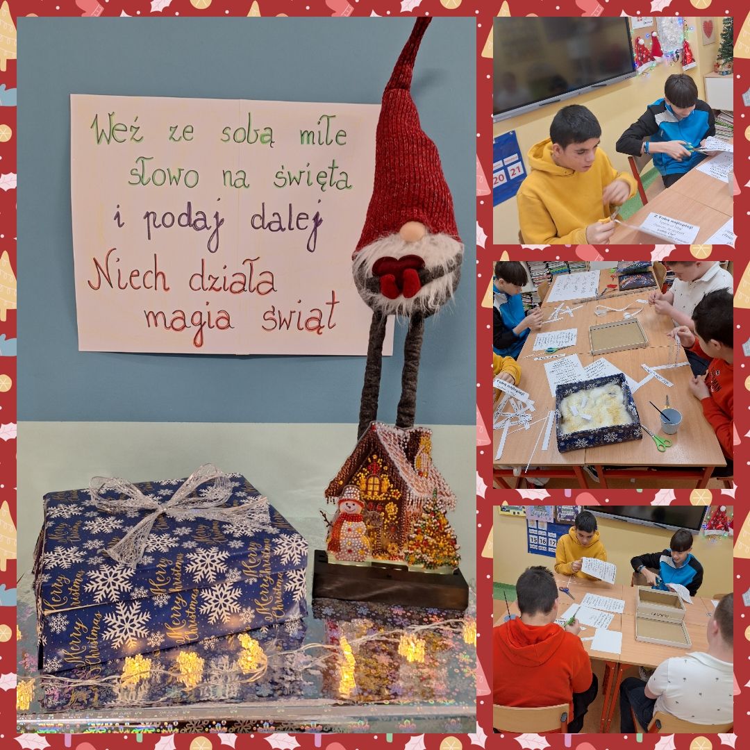 Uczniowie klasy VI a przygotowali kolorowy kartonik, a w jego wnętrzu ukryli karteczki z miłymi, świątecznymi słowami. Dekoracja stanęła na parterze i serdecznie zachęca wszystkich, by zatrzymać się na chwilę i zabrać ze sobą odrobinę dobroci. Niech te słowa niosą radość i ciepło każdemu, kto po nie sięgnie. Te małe gesty mają wielką moc w ten magiczny czas.