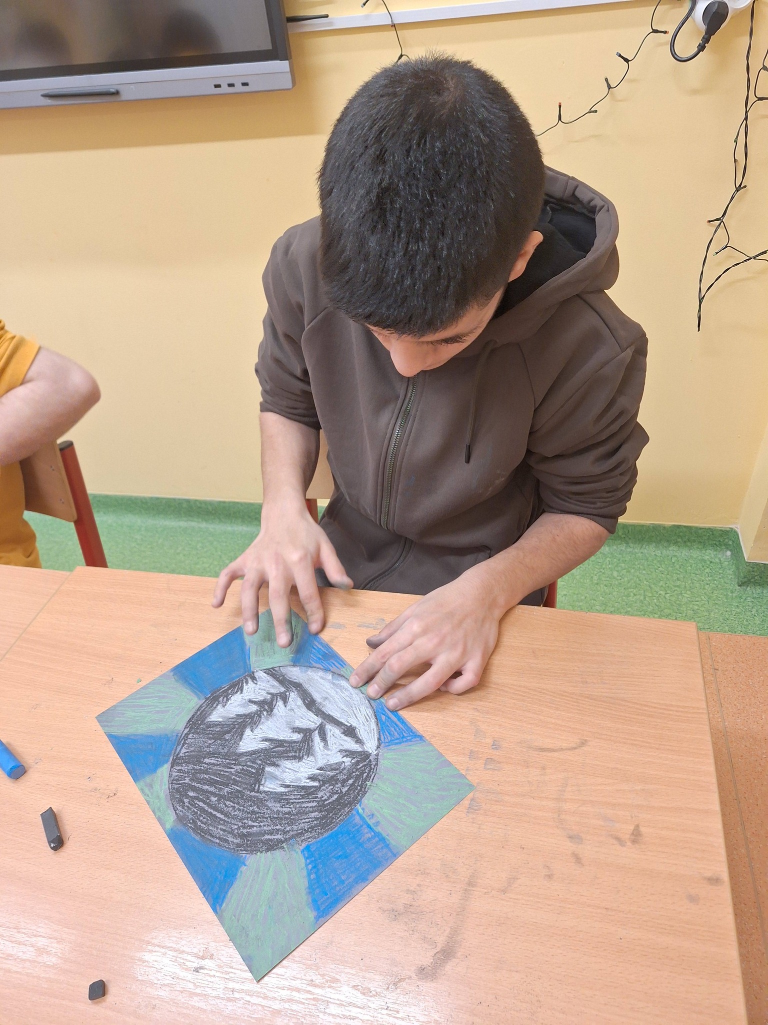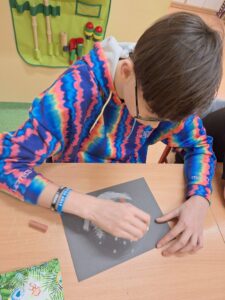 Zima za oknem stała się inspiracją do stworzenia wyjątkowych prac plastycznych. Uczniowie wykonali śnieżne kule pastelami suchymi na ciemnym tle, uzyskując efekt zimowego, magicznego krajobrazu. To ćwiczenie rozwija kreatywność, wrażliwość artystyczną oraz umiejętność pracy z kolorem i światłem. Kreatywna sztuka dla dzieci, która pozwala zamknąć zimę w małej kuli.