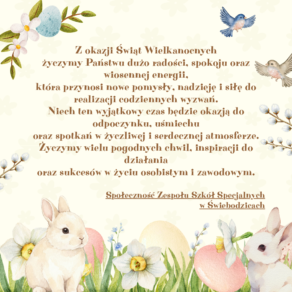 WESOŁYCH ŚWIĄT WIELKANOCNYCH 31 marca 2026 Zdrowych, pogodnych Świąt Wielkanocnych, pełnych spokoju, nadziei, radości oraz smacznego jajka i mokrego dyngusa w gronie najbliższych życzą Uczniowie Grono Pedagogiczne oraz Pracownicy Zespołu Szkół Specjalnych w Świebodzicach.