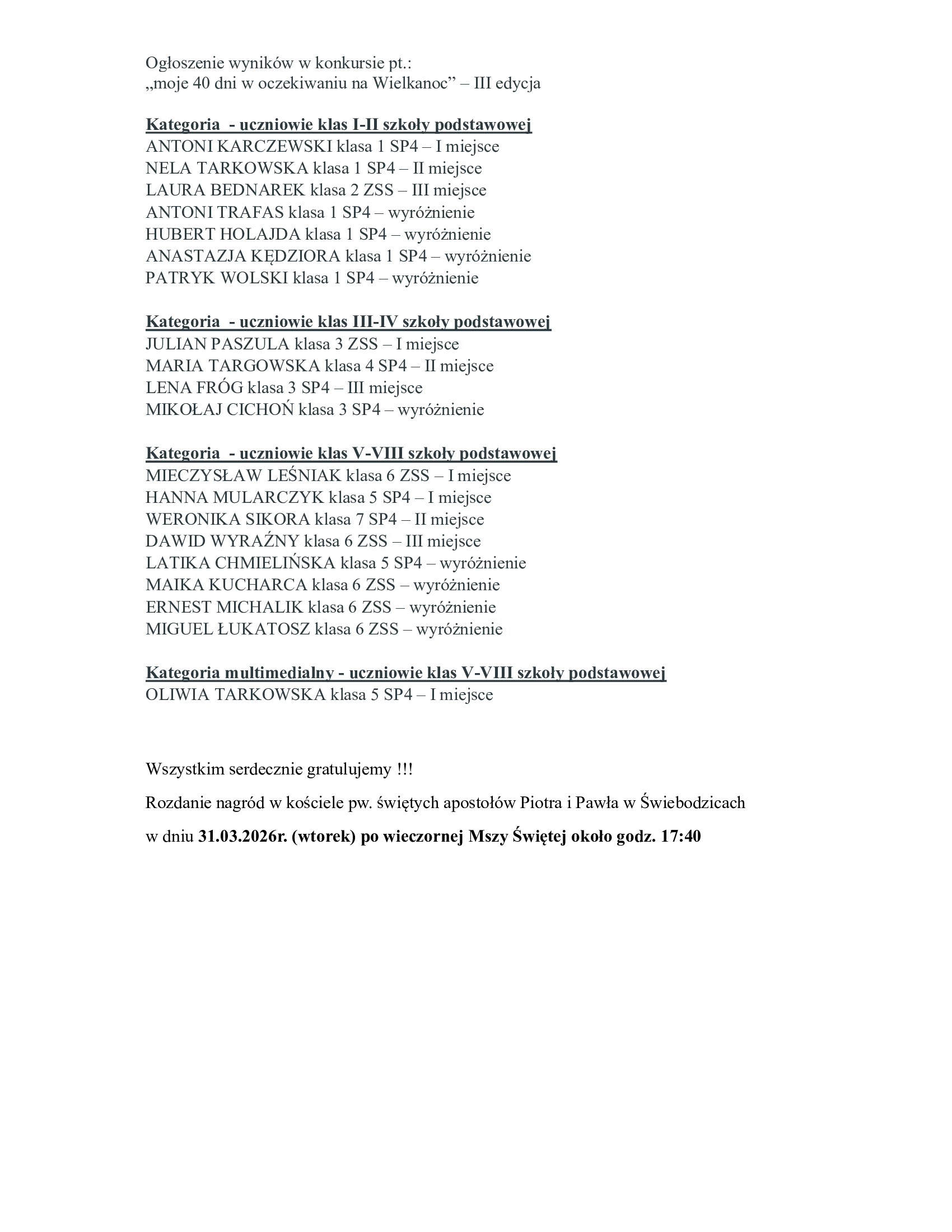 Szczęść Boże. Dzień Dobry. Serdeczne zapraszamy laureatów, opiekunów i przedstawicieli szkoły na Rozdanie Nagród w KONKURSIE PLASTYCZNO-MULTIMEDIALNYM „Moje 40 dni w oczekiwaniu na Wielkanoc” – III edycja. Rozdanie Nagród będzie miało miejsce w kościele pw. św. Apostołów Piotra i Pawła w Świebodzicach w dniu 31 marca 2026r. około godz. 17:30 (po wieczornej Mszy Świętej). Bardzo dziękujemy za zaangażowanie, realizację i przygotowanie prac.Więcej informacji na stronie parafialnej: