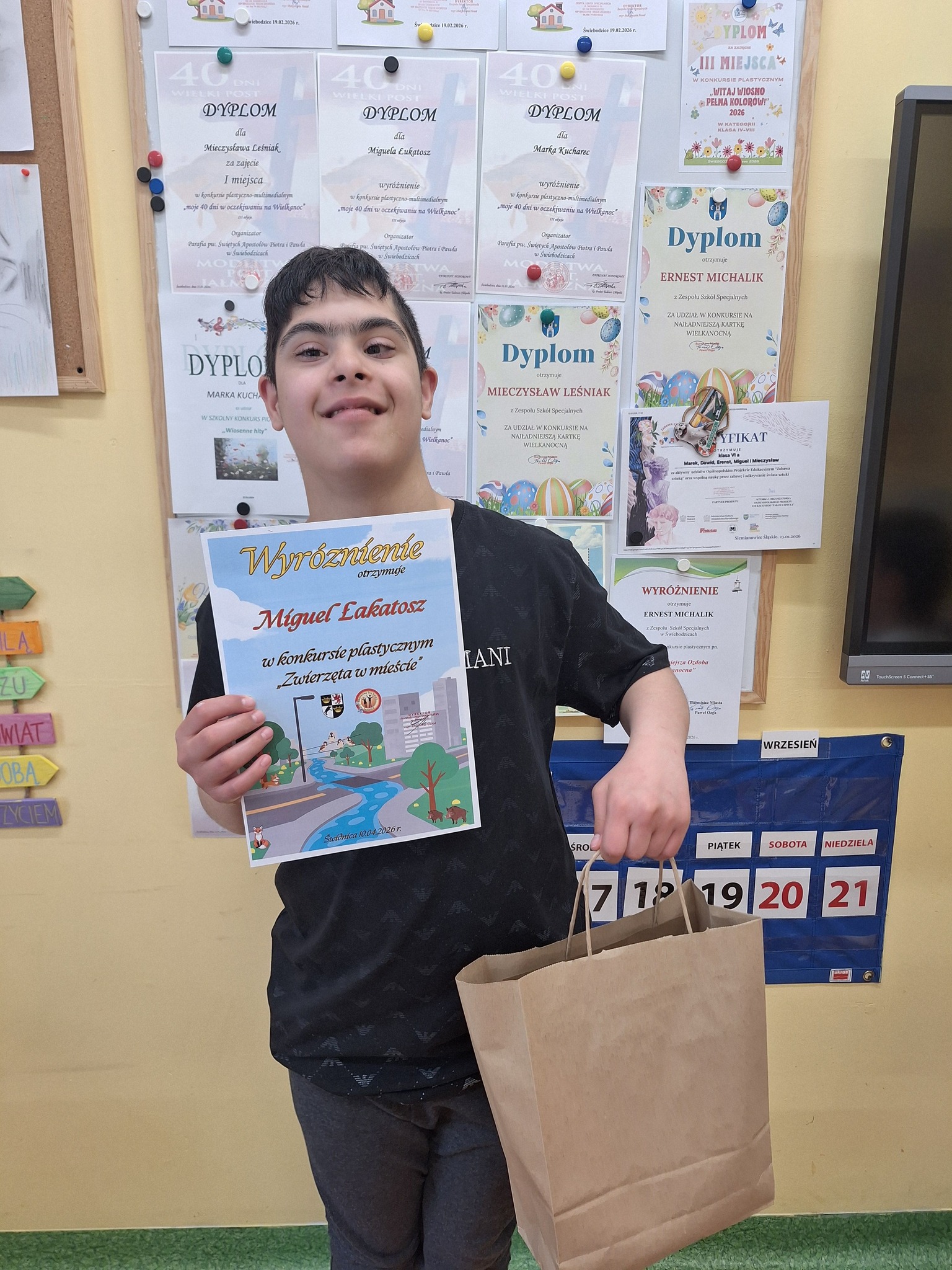 Miasto to nie tylko budynki i ulice – to także przestrzeń, którą dzielimy z naturą. W parkach, na podwórkach czy w koronach drzew żyje wiele gatunków ptaków i małych zwierząt, które często mijamy, nie zwracając na nie uwagi. Właśnie na to chciał zwrócić uwagę ogólnopolski konkurs „Zwierzęta w mieście”, organizowany przez Młodzieżowy Dom Kultury im. Mieczysława Kozara – Słobódzkiego. Konkurs miał charakter edukacyjno-artystyczny i zachęcał uczestników do uważnej obserwacji przyrody w miejskim otoczeniu oraz refleksji nad tym, jak ważna jest troska o wspólne środowisko. Z ogromną radością informujemy, że uczeń naszej szkoły, Miguel Łakatosz, zdobył wyróżnienie! Serdecznie gratulujemy i życzymy dalszych sukcesów oraz nieustającej pasji do odkrywania piękna przyrody – nawet tej tuż obok nas.